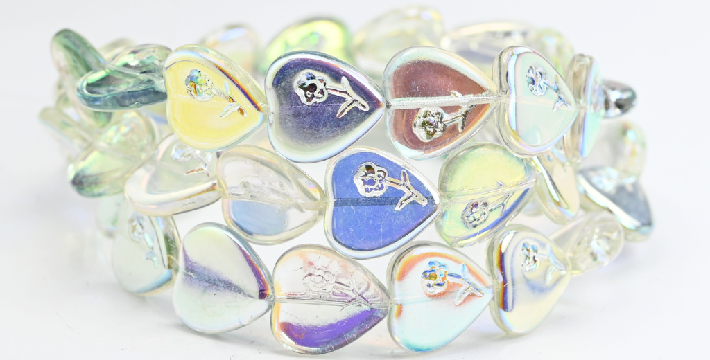 ハート型押しガラスビーズ(花付き)、クリスタルB Ab(00030-B-AB)、ガラス、チェコ共和国