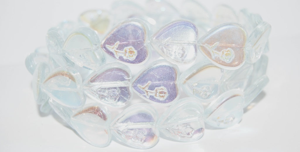 ハート型押しガラスビーズ(花付き)、透明ブルーAB(30010-AB)、ガラス、チェコ共和国