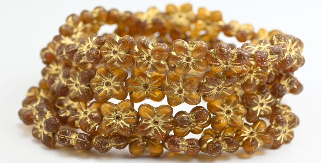 フラワープレスガラスビーズ、透明オレンジゴールドラインマットアンティーク(10040-54202-M-ANTIQ)、ガラス、チェコ共和国