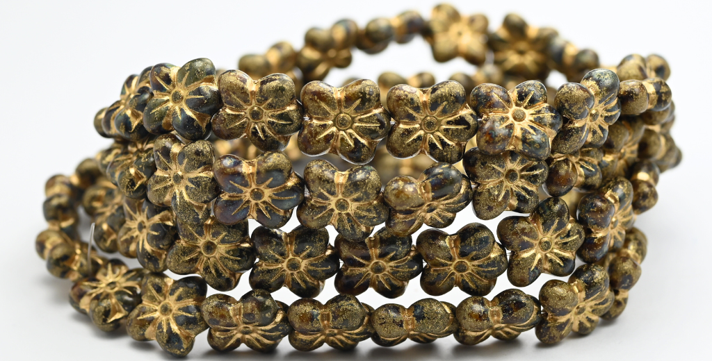 フラワープレスガラスビーズ、ミックスカラーブラウントラバーチンゴールドライン(MIX-BROWN-86800-54202)、ガラス、チェコ共和国~STRANDED