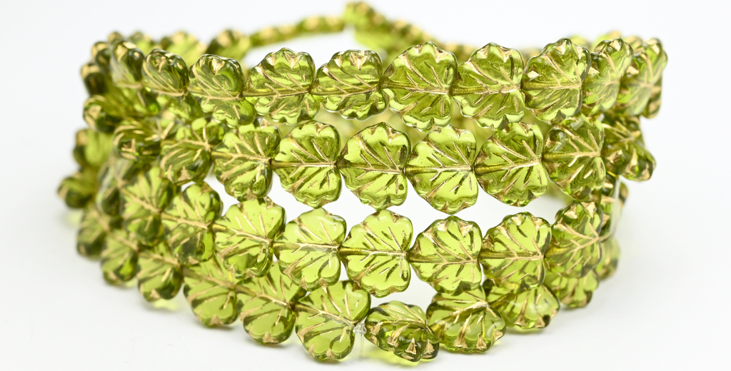 メープルリーフビーズ、透明グリーンゴールドライン(50200-54202)、ガラス、チェコ共和国~STRANDED