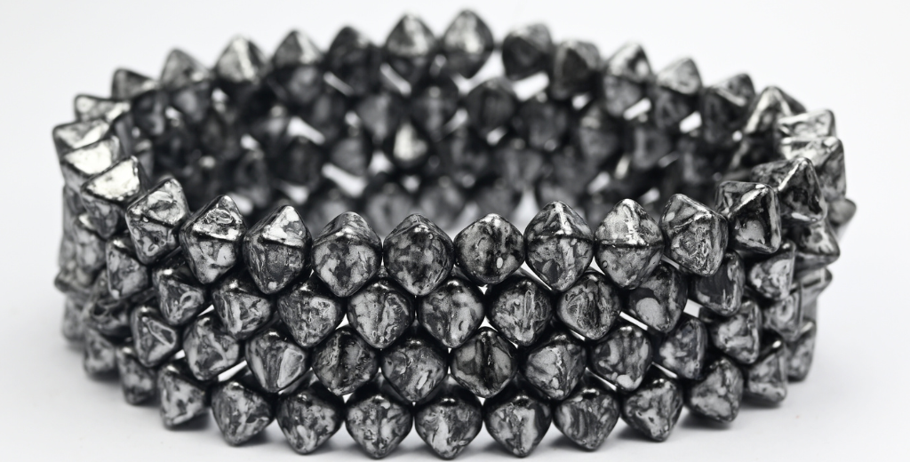 平らな双円錐形のプレスビーズ、ブラックシルバースプラッシュ(23980-86700)、ガラス、チェコ共和国~STRANDED