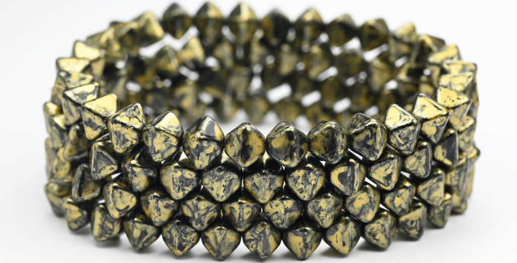 平らな双円錐形のプレスビーズ、ブラックゴールドスプラッシュ(23980-86720)、ガラス、チェコ共和国~STRANDED