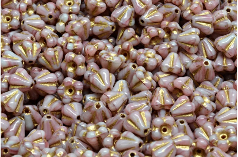 アウトレット 10グラム ベルフラワービーズ、4 x 6 mm、ミックスブルーピンクゴールドライニング(57713-54302)、ガラス、チェコ共和国