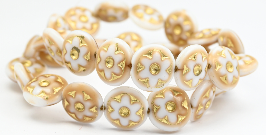 アウトレット 10グラム 丸型凸型フラワープレスガラスビーズ ベージュゴールドライン入り (07104-54202) ガラス製 チェコ共和国