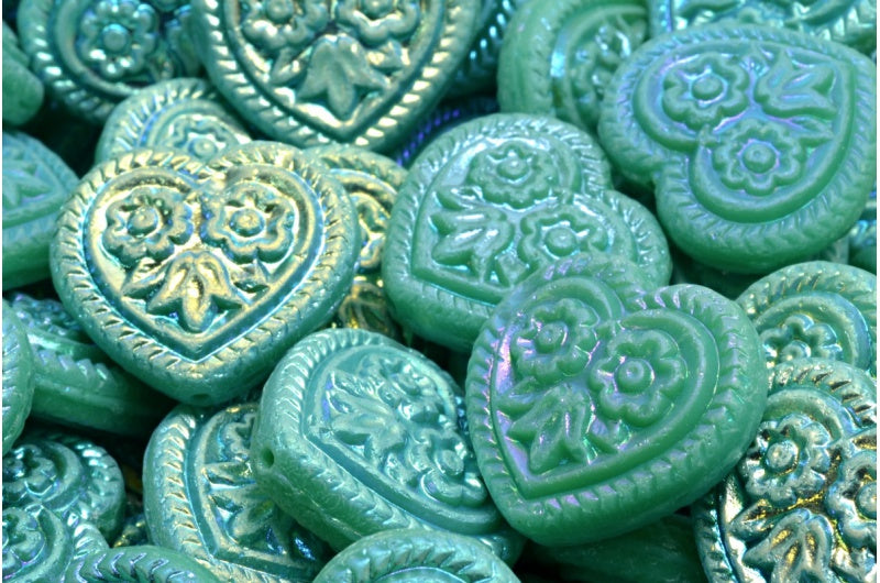 アウトレット 10グラム ハートとフォークロアフラワービーズ、17 x 17 mm、ターコイズアブフル(2Xサイド)(63130-28703)、ガラス、チェコ共和国