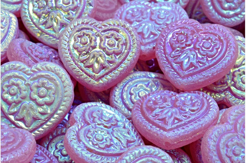 アウトレット 10グラム ハートとフォークロアフラワービーズ、17 x 17 mm、オパールピンクアブフル(2Xサイド)(71010-28703)、ガラス、チェコ共和国