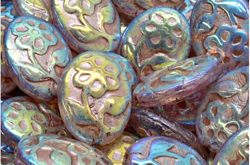 アウトレット 10グラム オーバルフラワービーズ付き、21 x 16 mm、クリスタルアブフル(2Xサイド)銅裏地(00030-28703-54324)、ガラス、チェコ共和国