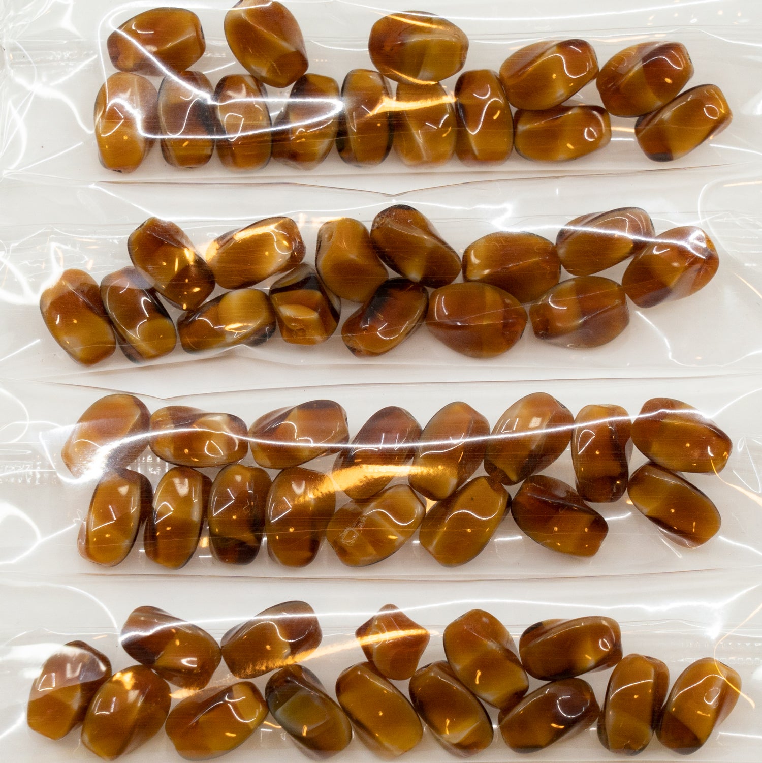 アウトレット 10グラム ツイストオーバルプレスガラスビーズ、9 x 7 mm、ブラウンストライプ(ブラウンストライプ)、ガラス、チェコ共和国