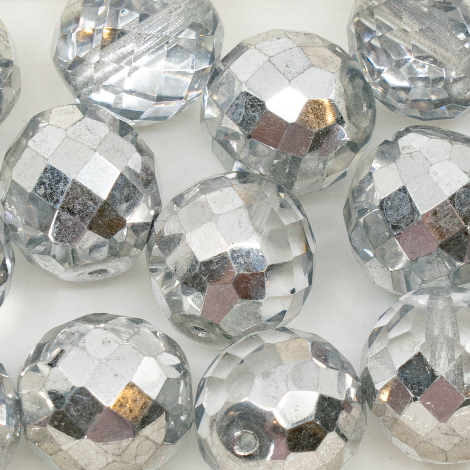 アウトレット 10グラム ファセットラウンドファイアポリッシュビーズ、18 x 18 mm、クリスタルクリスタルシルバーハーフコーティング(00030-27001)、ガラス、チェコ共和国