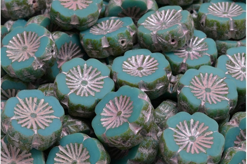 アウトレット 10グラム テーブルカットハワイフラワービーズ、14 x 14 mm、ターコイズトラバーチンピンクライン(63130-86800-54321)、ガラス、チェコ共和国