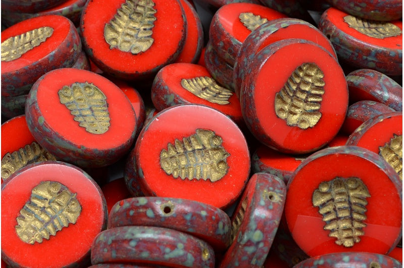 アウトレット 10グラム テーブルカット トリロビットビーズ、17 x 17 mm、レッドトラバーチンゴールドライニング(93180-86800-54302)、ガラス、チェコ共和国