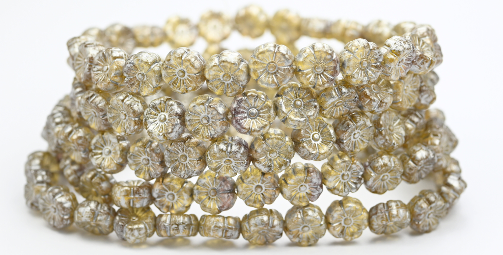 アウトレット 10グラム ハワイアンフラワービーズ、8 x 8 mm、透明ライトトパーズイエローシルバースプラッシュ(10020-86700)、ガラス、チェコ共和国