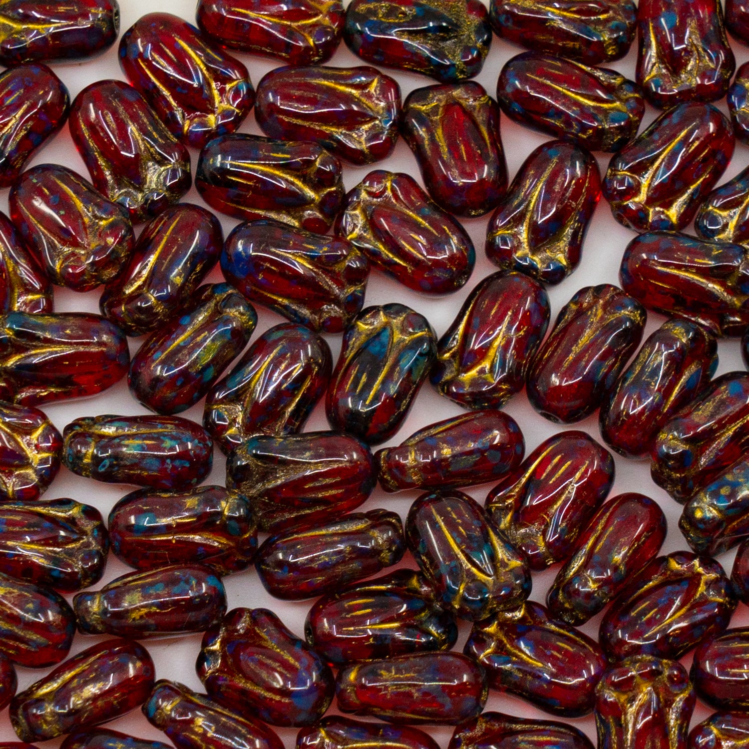 アウトレット 250g/50g チューリップバッドビーズ、12 x 8 mm、ルビーレッドトラバーチンゴールドライニング(90080-86800-54302)、ガラス、チェコ共和国