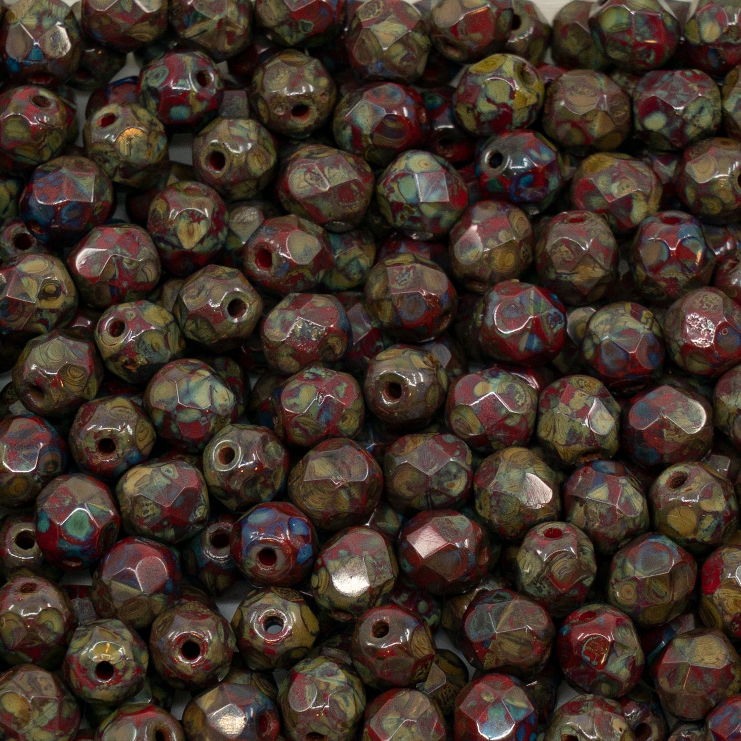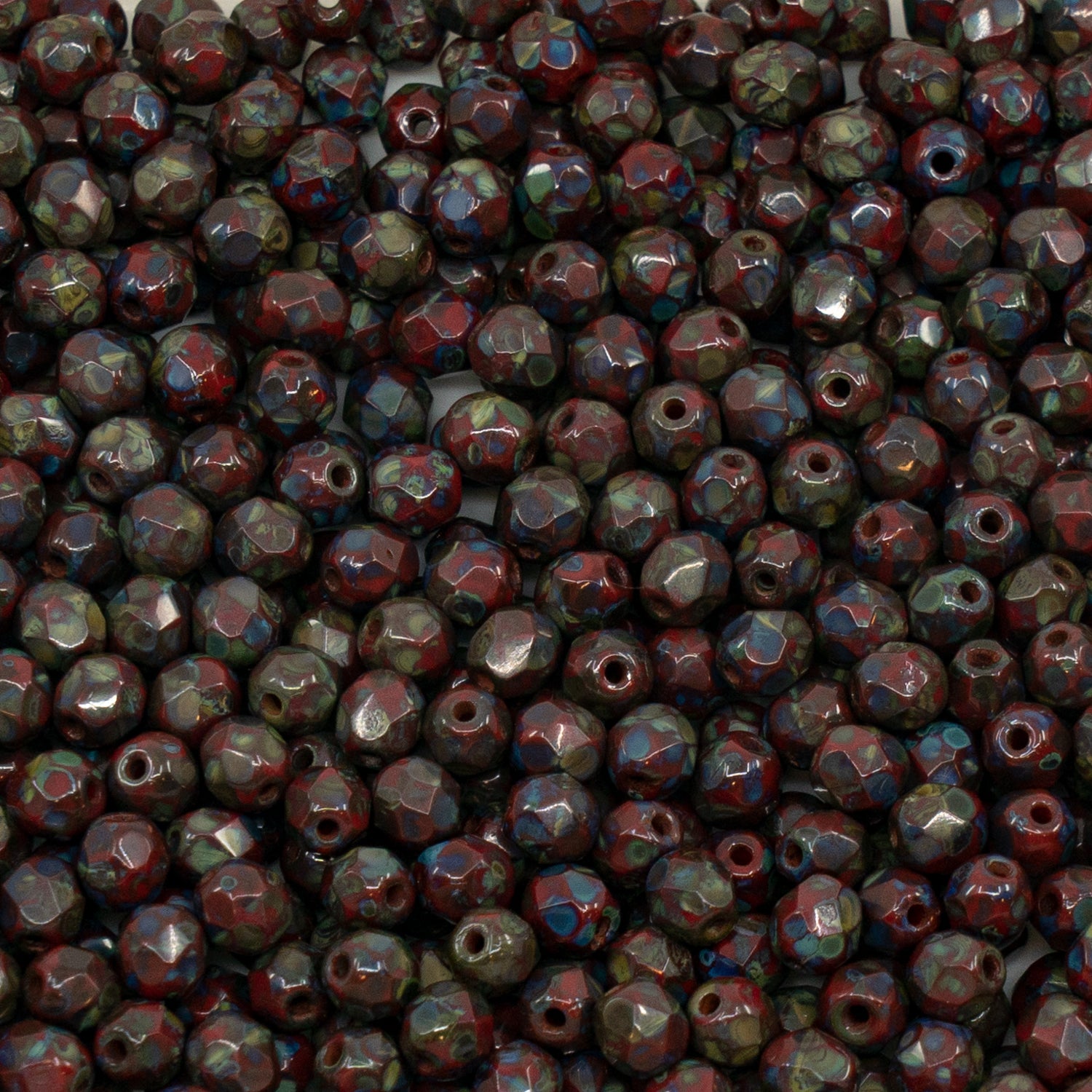 アウトレット(125g/250g)ファセットラウンドファイアポリッシュビーズ、不透明レッドトラバーチン(93200-86800)、ガラス、チェコ共和国