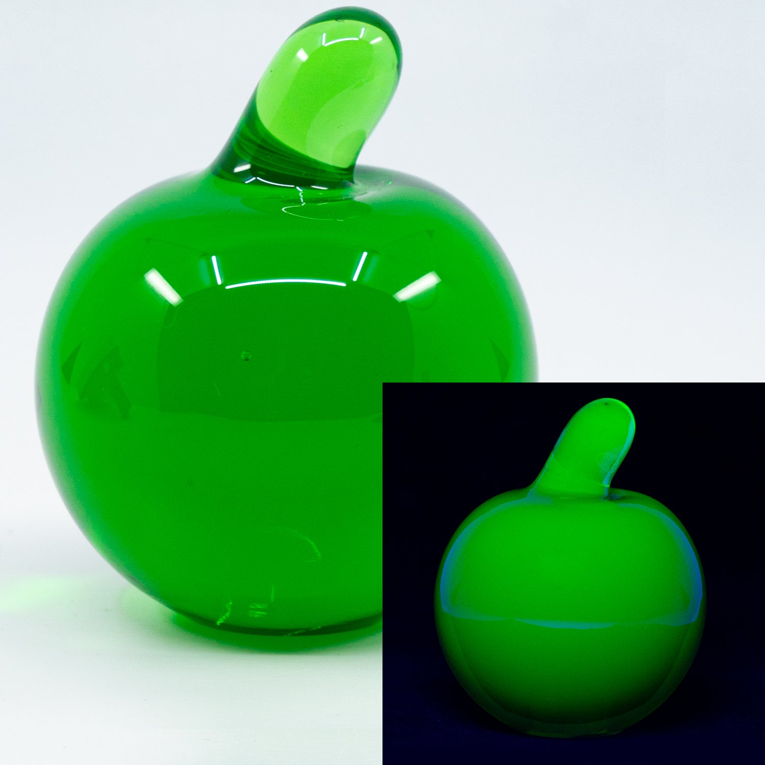 ウランガラス製洋梨型ペーパーウェイト – 手作りUV反応性アートフィギュア、チェコ共和国