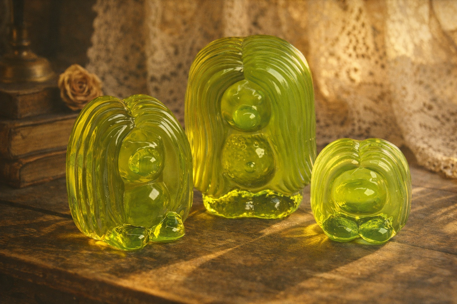 この鮮やかなウランガラス彫刻は、コレクターに人気の象徴的なネオングリーンの輝きを放ちます。滑らかに磨かれた表面と自然な曲線を描くフォルムで手作りされたこの彫刻は、どんなディスプレイにも鮮やかな彩りを添えます。紫外線またはブラックライトの下では、放射性物質のような鮮やかな蛍光を発し、本物のウランガラスの特徴を放ちます。骨董品キャビネット、モダンな棚、テーマのある装飾に最適な、スタイリッシュでユニークなアート作品です。✔ 本物のウランガラス ✔ 天然の紫外線反応性 - ブラックライトの下で強烈に輝きます ✔ コレクター、科学愛好家、そしてガラスアートの展示に最適です