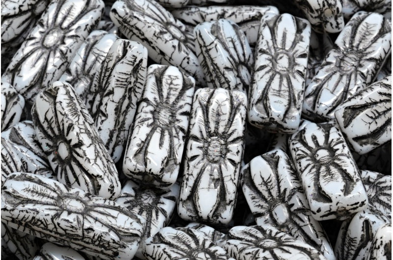 Flower Rectangle Beads, White 43815 (02010-43815), Glass, Czech Republic