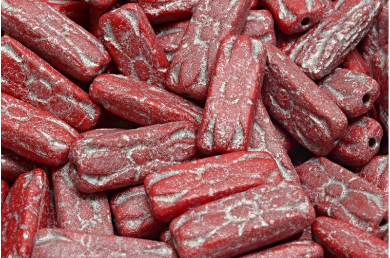 Flower Rectangle Beads, Opaque Red Etched Silver Lined (93210-etch-54301), Glass, Czech Republic