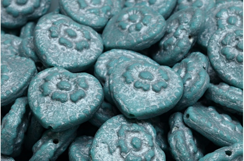 Heart Beads With Rose, Turquise Etched Silver Lined (63140-ETCH-54301), Glass, Czech Republic