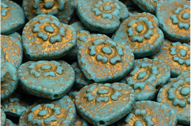 Heart Beads With Rose, Turquise Etched Gold Lined (63140-ETCH-54302), Glass, Czech Republic