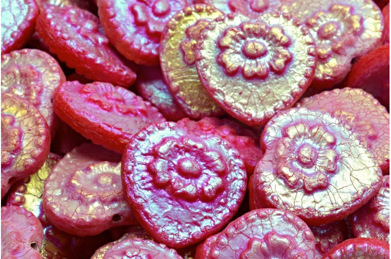 Heart Beads With Rose, Opaque Red Etched Ab Full (2X Side) (93200-etch-28703), Glass, Czech Republic