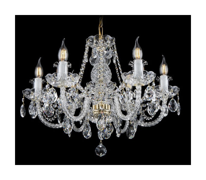 Traditional Bohemia crystal chandelier with 5 arms. All components are made from genuine Bohemia crystal - BOHEMIA CZECH REPUBLIC ��� LEAD CRYSTAL OVER 24% PbO. Lead crystal trimmings ensure incredible light reflection and sparkling. Suitable for kitchen, sitting rooms, sleeping rooms, corridors. Available in 5, 6, 8,10 arms plus wall lamp. Brass metal parts with golden coating. 5 years guarantee. Easy to assemble. Genuine Bohemia traditional crystal glass chandelier lighting fixture classic antique design with 6 bulbs AMELI (Czech Republic). Gold colour