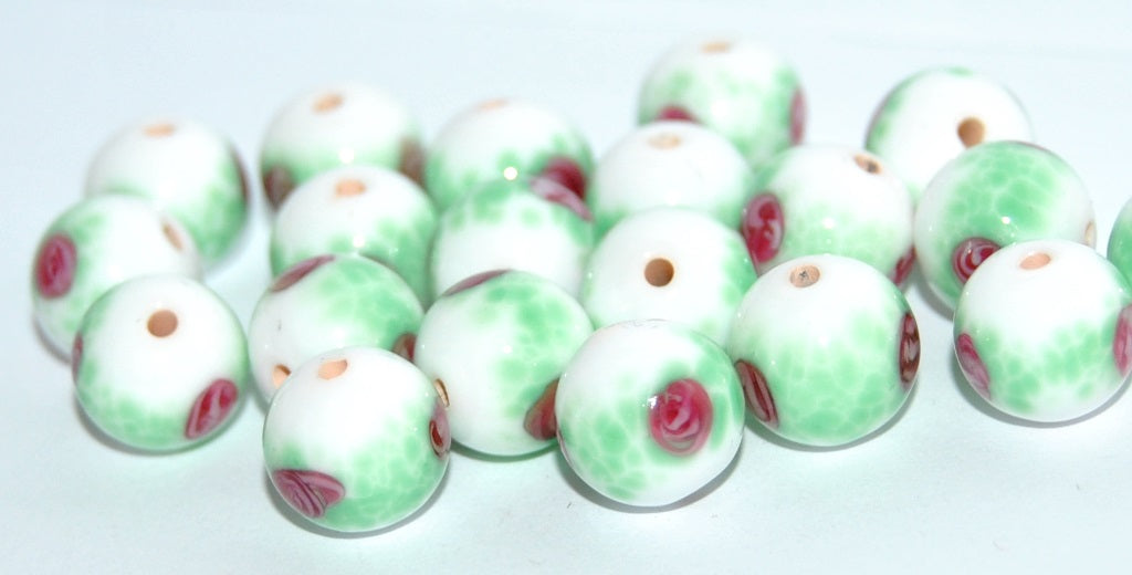 Czech Glass Hand Made Round Lampwork Beads With Flower, (A), Glass, Czech Republic