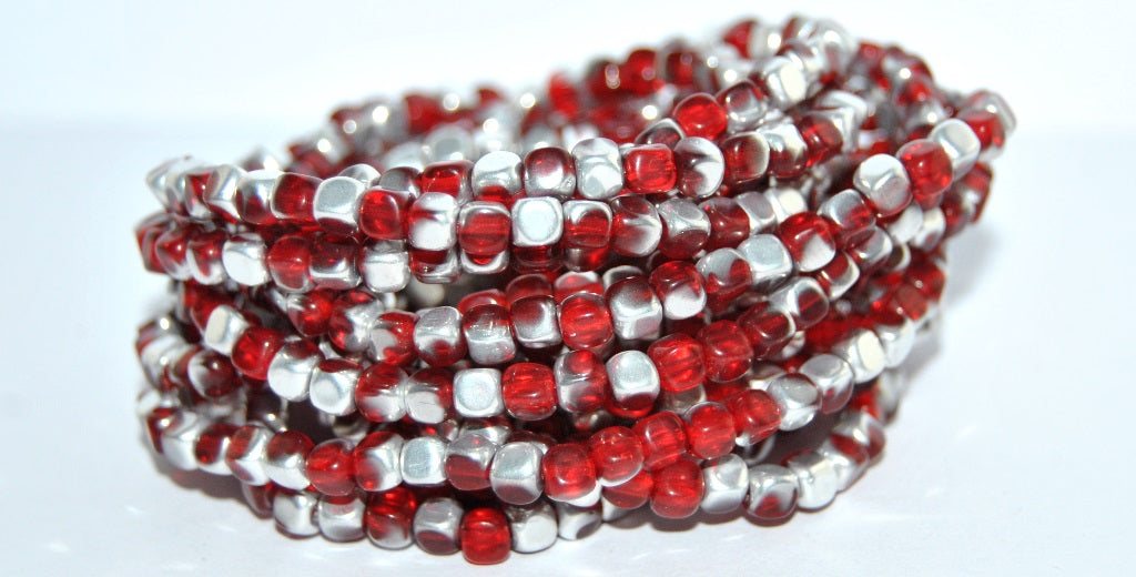 Czech Glass Pressed Beads Cube, Ruby Red Crystal Silver Half Coating (90080 27001), Glass, Czech Republic