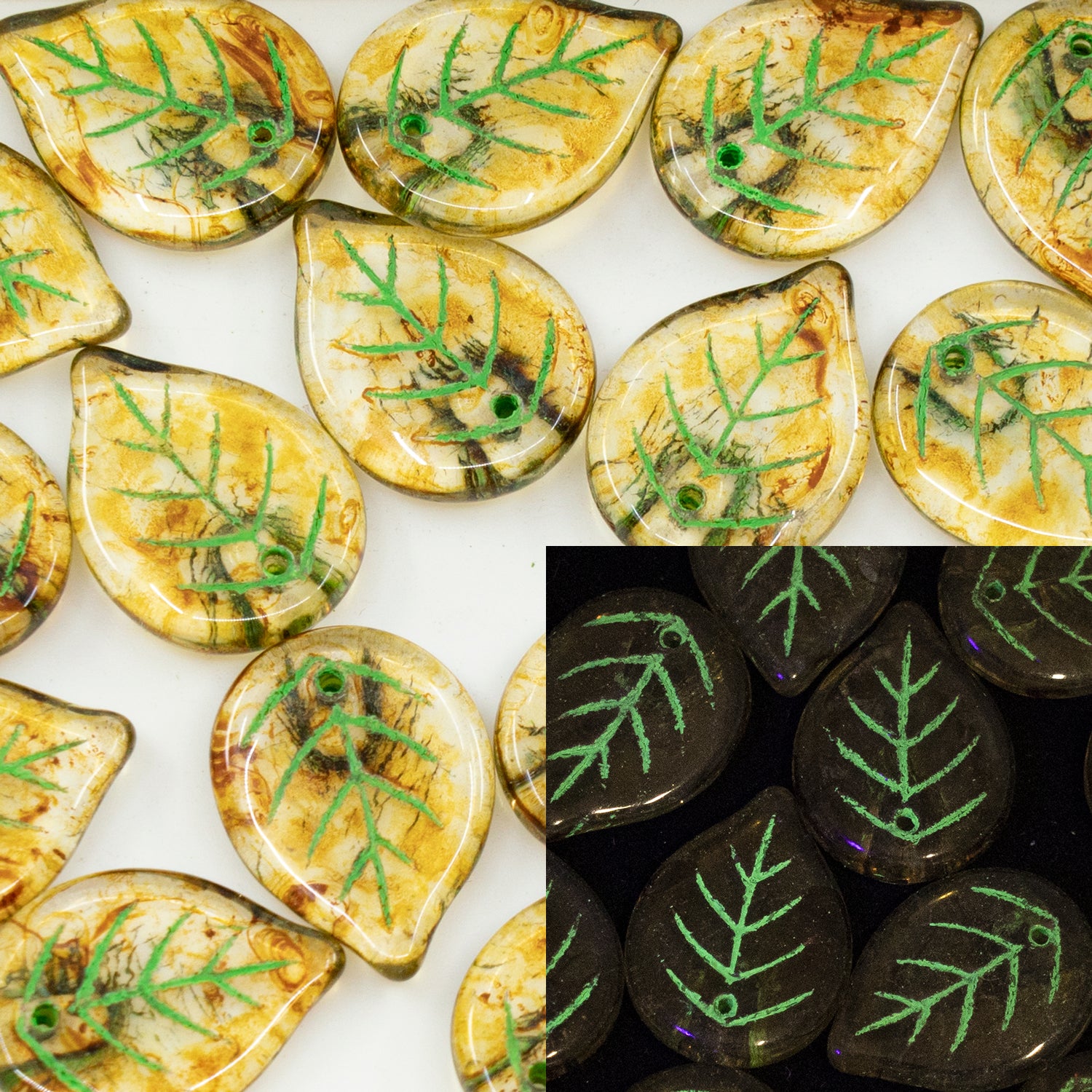 OUTLET 250g Apple Leaf Beads, 18 x 13 mm, Crystal Stain With Luster Blue Neong (00030-65431-neonG), Glass, Czech Republic