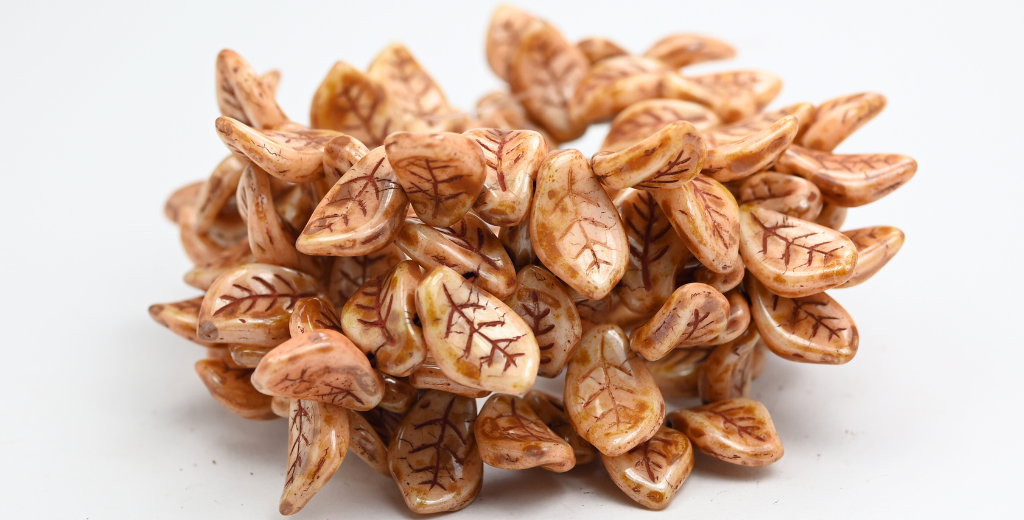 Ovate Leaf Pressed Glass Beads, White Travertin Luster Brown Full Coated (02010-86800-14413), Glass, Czech Republic