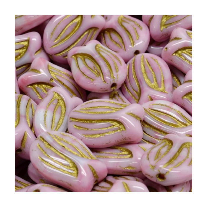 Pressed Czech glass beads flower tulip, Pink White Gold, Glass, Czech Republic