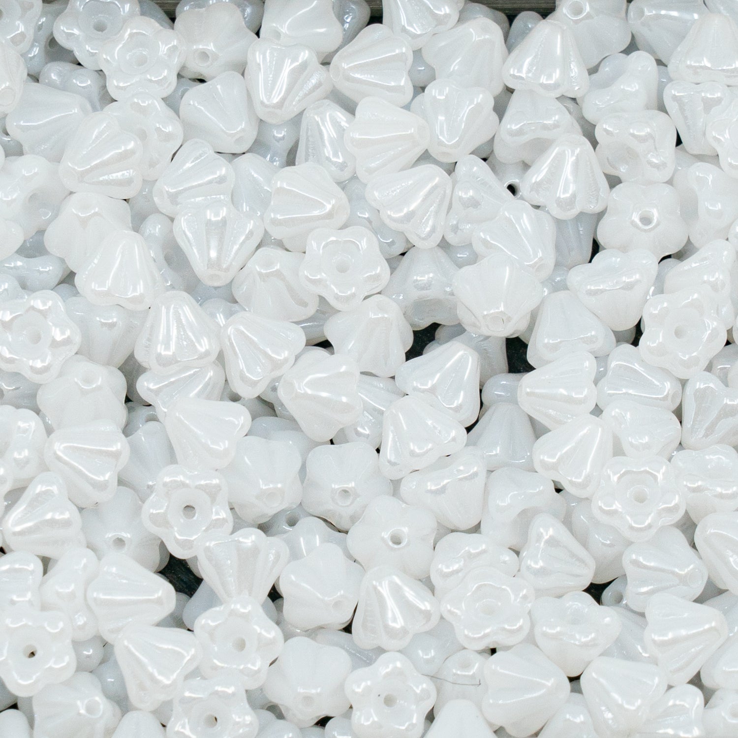 OUTLET 250g/50g Bell Flower Beads, 4 x 6 mm, White Rainbow Iris (02010-21402), Glass, Czech Republic