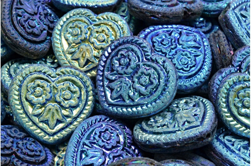 OUTLET 10 grams Heart With Folklore Flowers Beads, 17 x 17 mm, Black Ab Full (2X Side) (23980-28703), Glass, Czech Republic