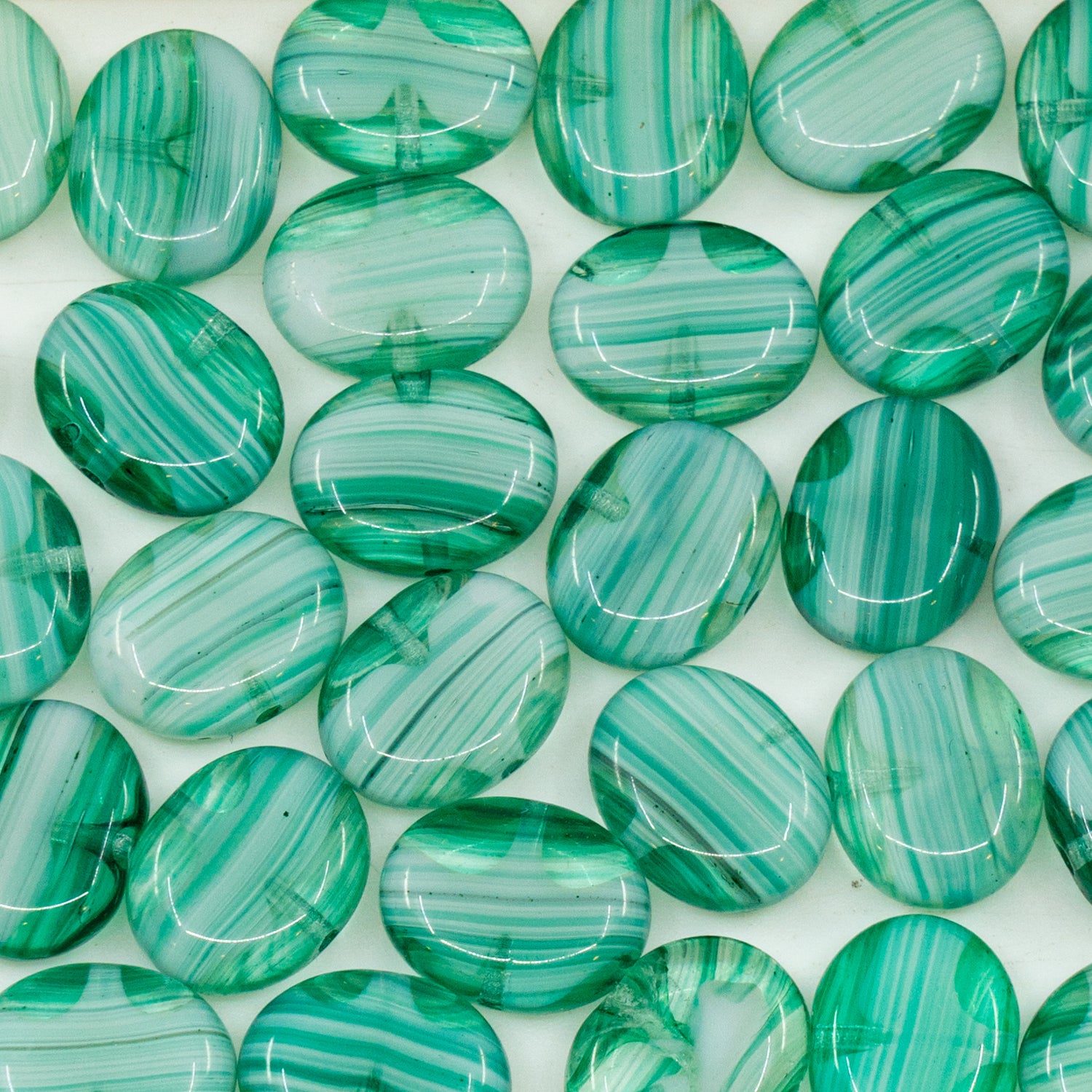 OUTLET 10 grams Flat Oval Beads, 9 x 13 mm, Green Stripes (green-stripes), Glass, Czech Republic