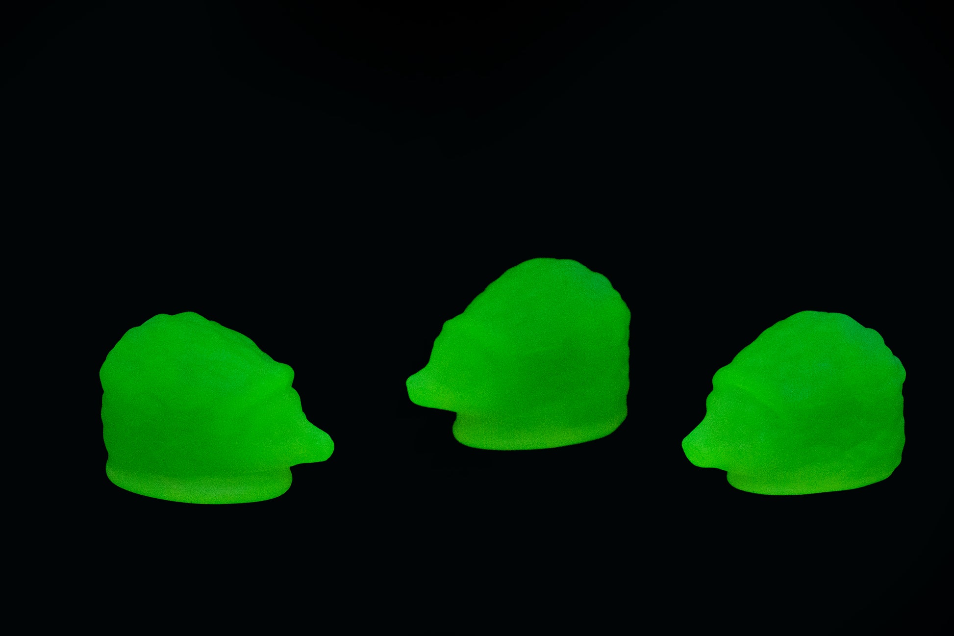 Stunning hedgehogs handcrafted from authentic uranium glass, celebrated for its vibrant green coloration and brilliant fluorescence under UV light. Each piece carries the unique glow and collectible appeal that uranium glass enthusiasts love.