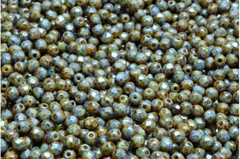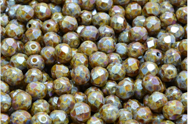 圆形火抛光刻面珠,粉笔白紫棕光泽斑点 (03000-65329),波西米亚水晶玻璃,捷克共和国