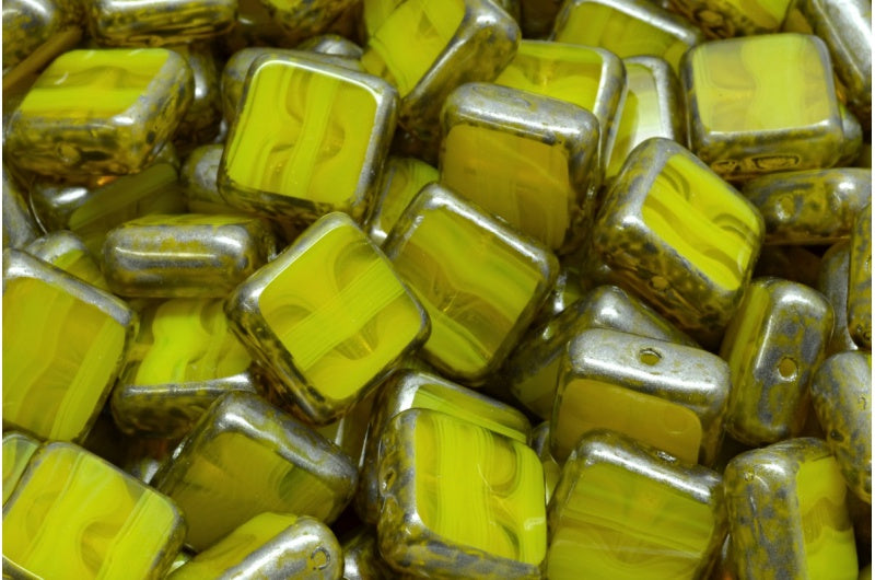 桌切方形珠,蛋白石黄银溅射(81210-86790),玻璃,捷克共和国
