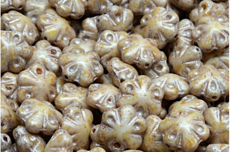 OUTLET 10 克民间传说花朵珠,11 x 11 毫米,白色奶油光泽斑点 (02010-65321),玻璃,捷克共和国