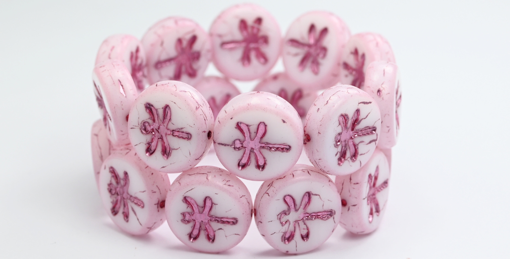 圆形扁平蜻蜓压制玻璃珠,白色粉红色内衬 (02010-54321),玻璃,捷克共和国