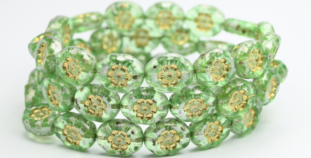 椭圆形压制玻璃珠,花朵图案,透明绿银溅金内衬 (50800-86700-54202),玻璃,捷克共和国
