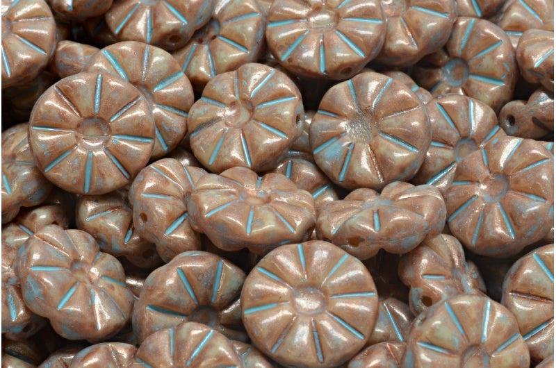 OUTLET 10克向日葵珠,12 x 12毫米,不透明米色铜色斑点绿松石色(13010-86750-33309),玻璃,捷克共和国