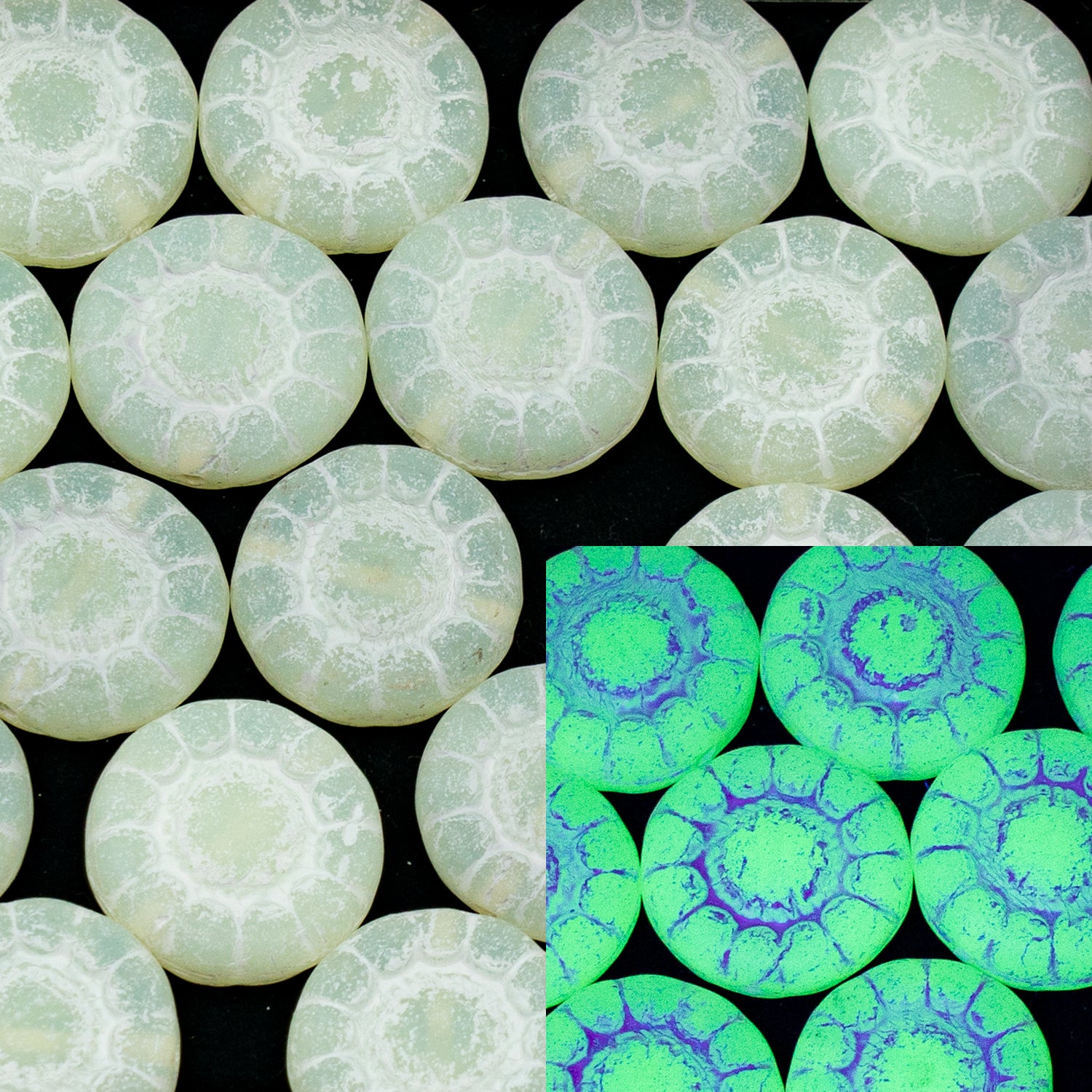 10克压制扁平向日葵珠,13 x 13毫米,黄色蛋白石哑光白内衬,玻璃,捷克共和国